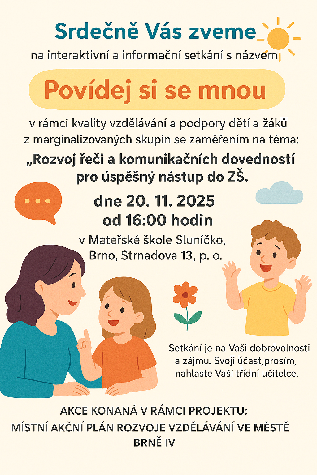 Vážení rodiče, srdečně vás zveme na interaktivní a informační setkání „Povídej si se mnou“, které se uskuteční ve čtvrtek 20. listopadu 2025 od 16:00 hodin v naší Mateřské škole Sluníčko, Strnadova 13.